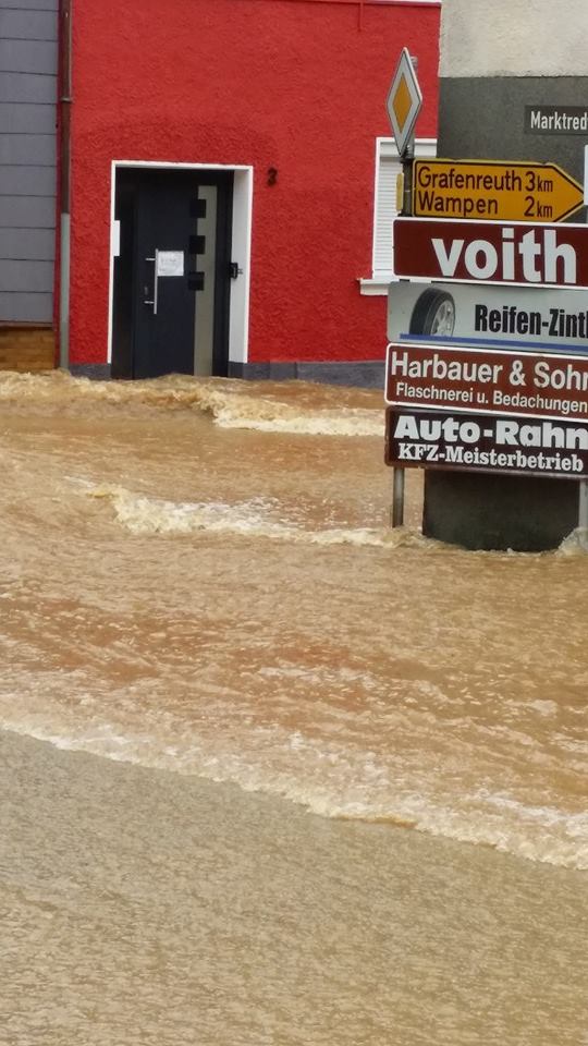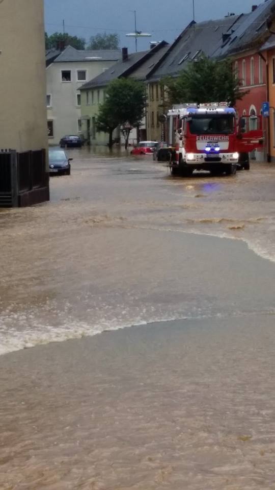 In Thiersheim gehen in wenigen Minuten bis zu 45 Liter Regen pro Quadratmeter nieder. Zahlreiche Keller laufen voll. 250 Feuerwehrleute haben alle Hände voll zu tun, die Schäden zu beseitigen.